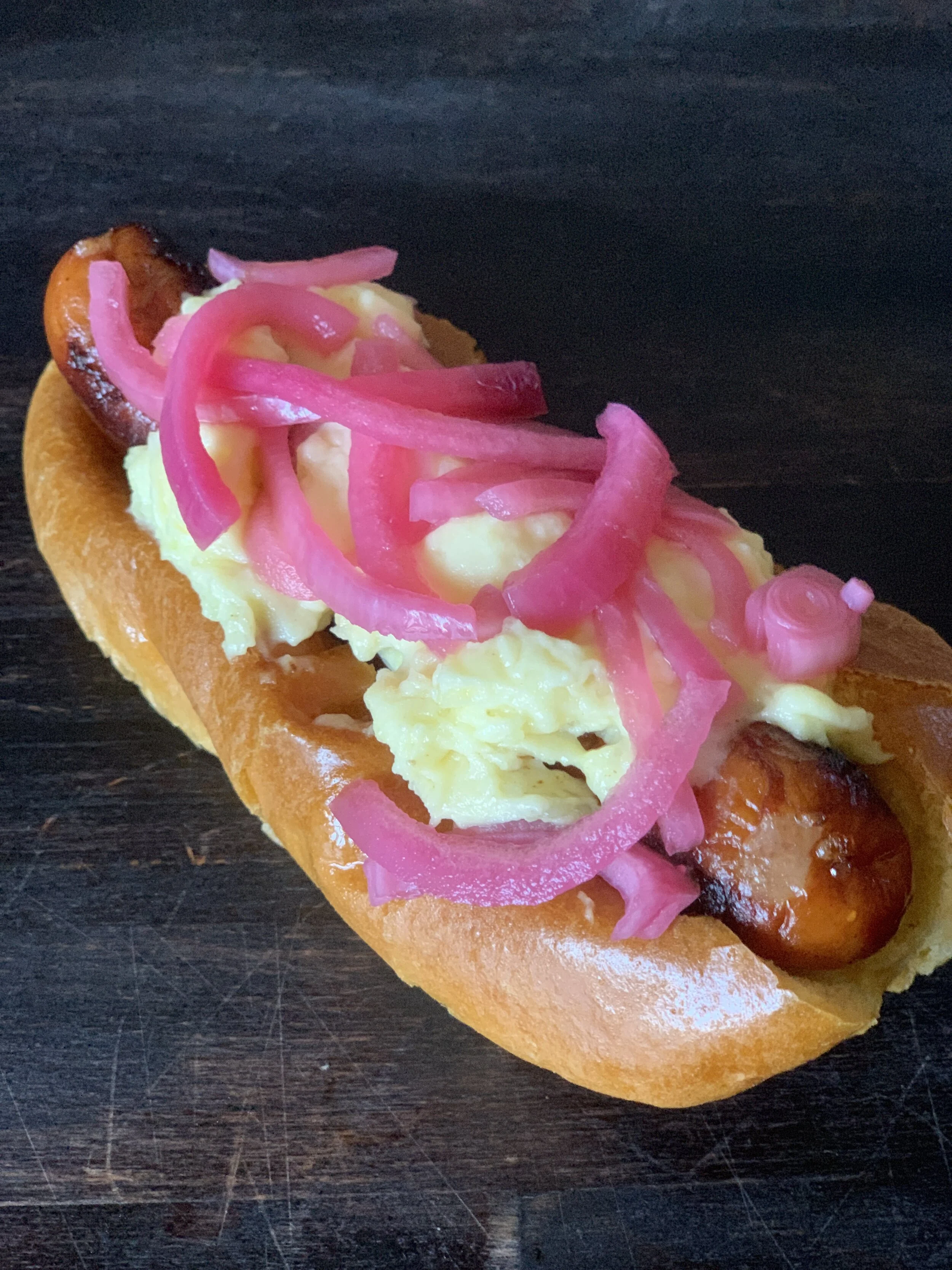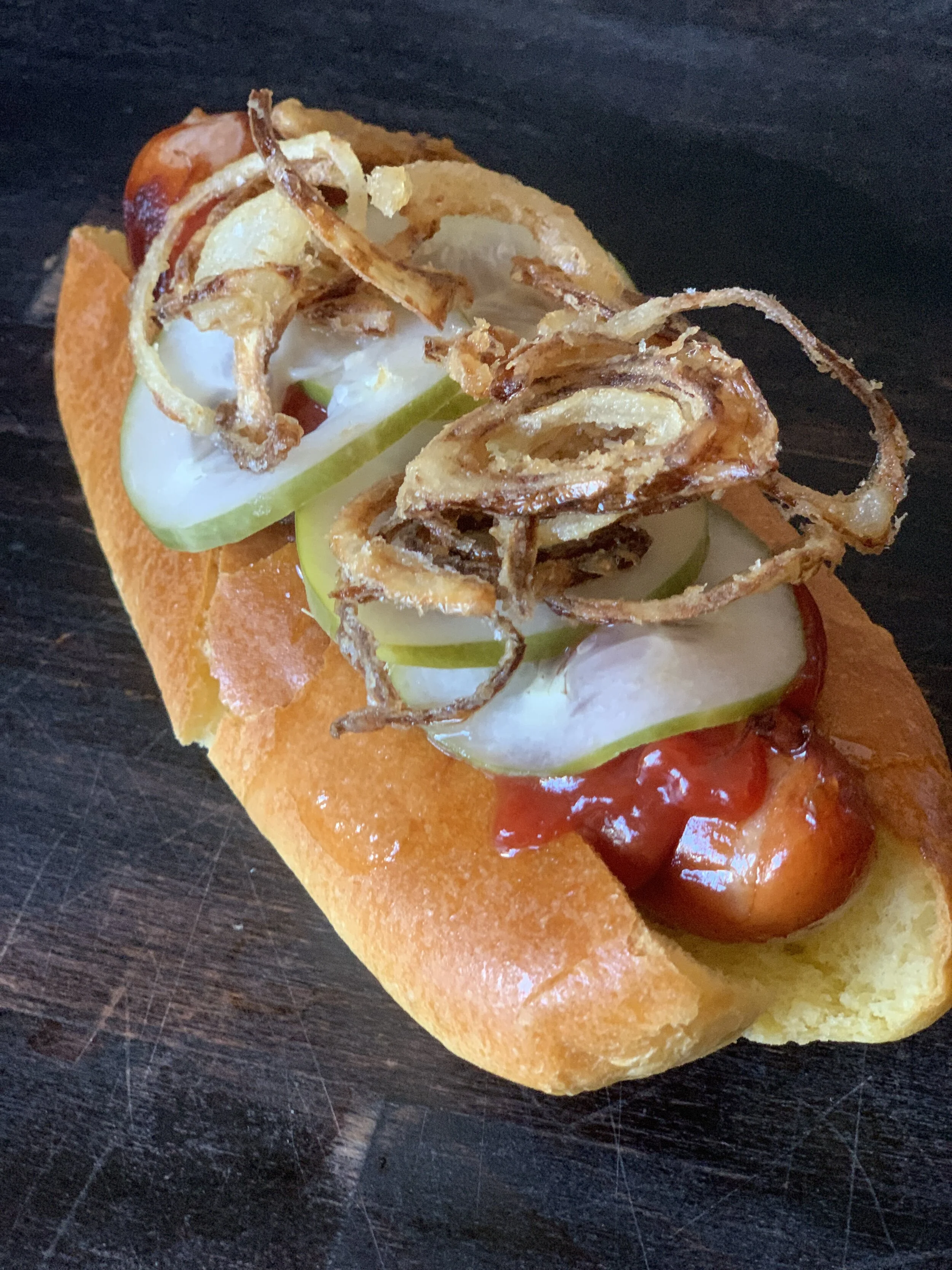 Lækre hotdogs med karameliserede rødløg, agurkesalat og ristede løg